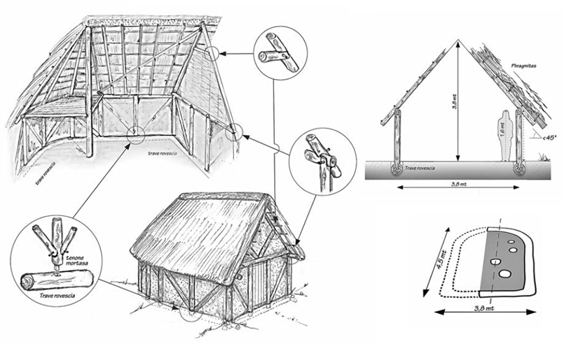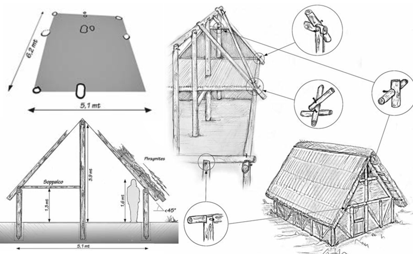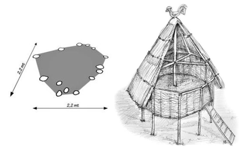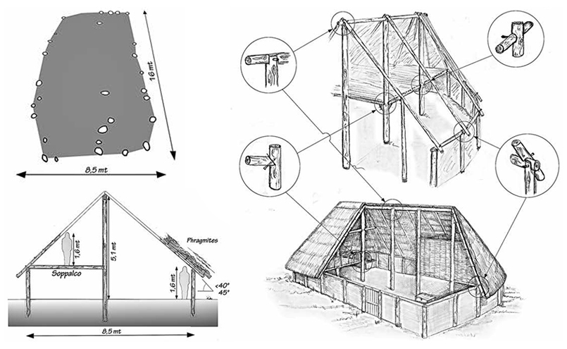 La struttura, al momento dello scavo, si presentava in buono stato di conservazione permettendo una lettura interpretativa abbastanza dettagliata per planimetria e articolazione. Era un grande edificio a forma di barca a due navate – tipo così definito dalla letteratura specialistica – accuratamente pianificato, con un lato quasi seminterrato per livellare e dimensioni di circa 16 x 8,5 m.