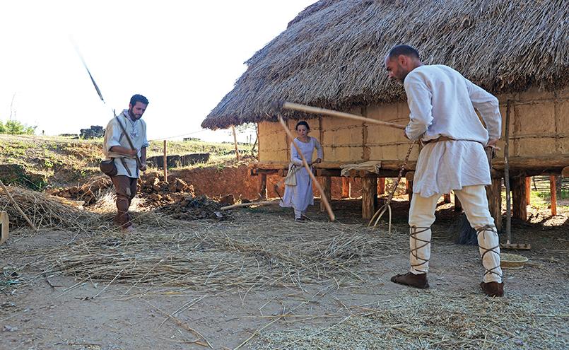 Mentre alcuni abitanti sono impegnati nei loro mestieri quotidiani, i contadini hanno preparato il tribolo e i correggiati per battere le spighe. Muniti di pale, rastrelli, forconi e setacci, tutti sono pronti per dare una mano.