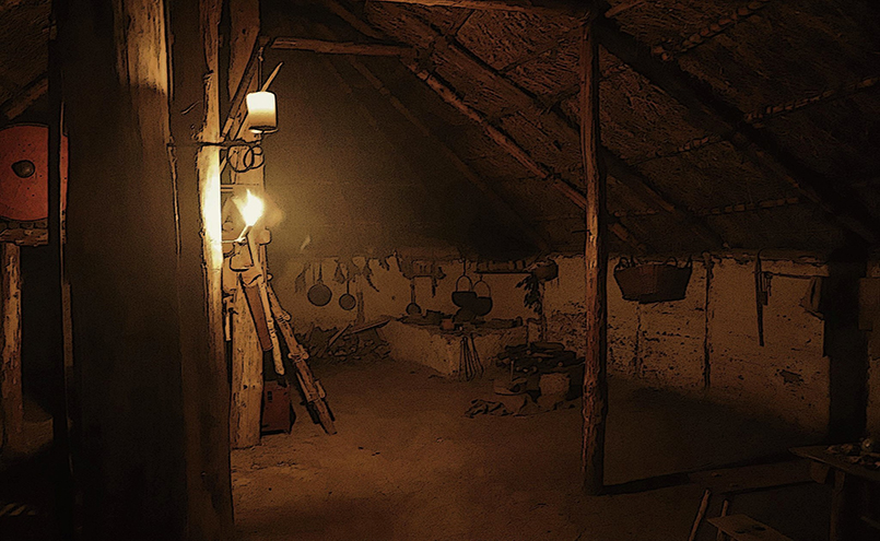 Le donne tessono e cuciono, il fabbro lavora alla forgia, il fornaio prepara il pane e tutti gli abitanti sono impegnati nei loro lavori.