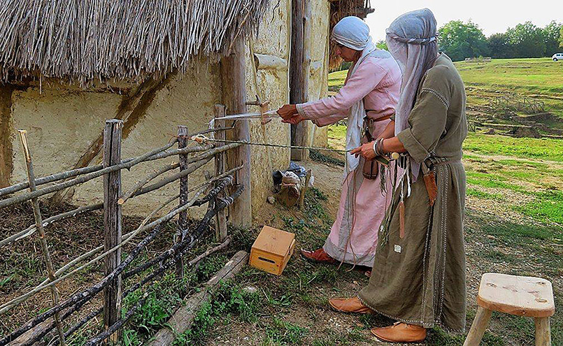 Le donne tessono e cuciono, il fornaio prepara il pane e tutti gli abitanti sono impegnati nei loro lavori.