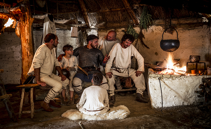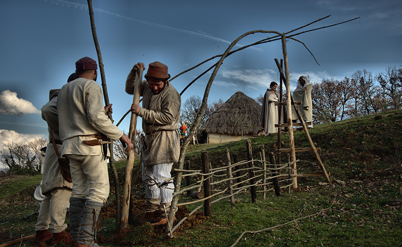 Le donne tessono e cuciono, il fabbro lavora alla forgia, il fornaio prepara il pane e tutti gli abitanti sono impegnati nei loro lavori.