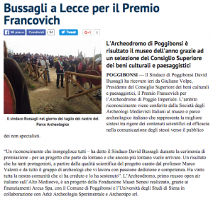POGGIBONSI — Il Sindaco di Poggibonsi David Bussagli ha ricevuto ieri da Giuliano Volpe, Presidente del Consiglio Superiore dei beni culturali e paesaggistici, il Premio Francovich per l’Archeodromo di Poggio Imperiale. L’ambito riconoscimento viene conferito dalla Società degli Archeologi Medievisti Italiani al museo o parco archeologico italiano che rappresenta la migliore sintesi tra rigore dei contenuti scientifici ed efficacia nella comunicazione degli stessi verso il pubblico dei non specialisti.